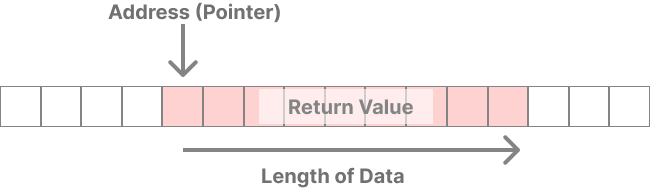 なので、文字列を返したいときにはまずWASM側のメモリに符号なし8ビット整数(u8)の配列として文字列を格納します。そして、JS側がWASMメモリのどこから、何文字分読めばいいかを把握できるように、そのアドレスと長さを伝える必要があります。