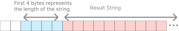 関数は長さのプレフィックスがついた文字列へのポインタを返します。JS側は最初の4バイト(32ビット)を読み取って長さを把握し、5バイト目からその長さ分だけ文字列として読み取ります。