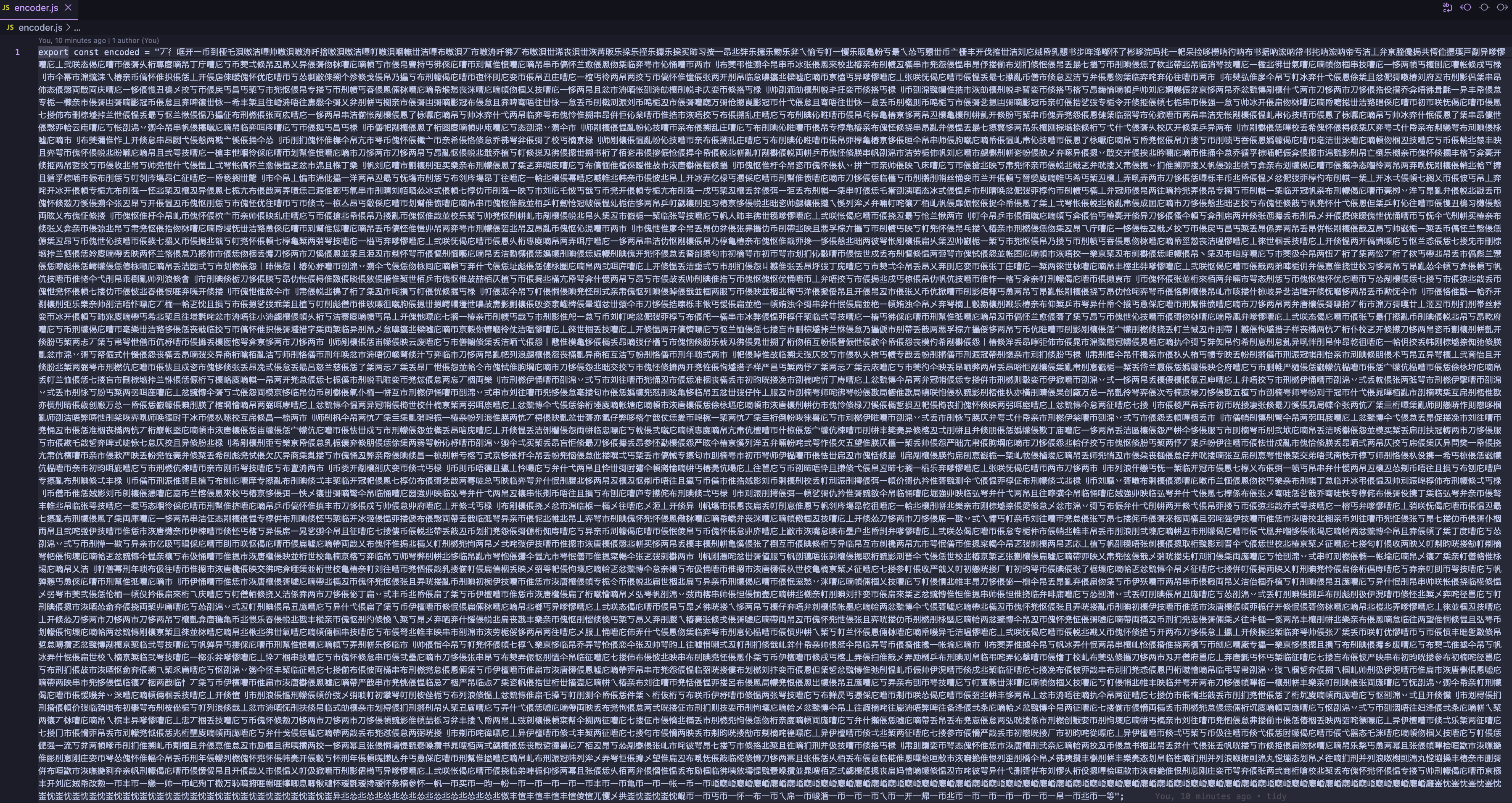 そして、完成したのがこちらです。encoder.js に結果が格納されました(10,000文字以上ありますが、なんとかスクリーンショットに収めました)。